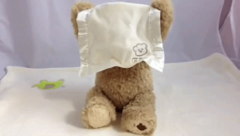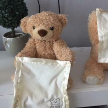 Like any animal, the Peek-a-Boo Bear Toy will need his bath time too. To clean, simply surface wash with water and soap. Do not machine-wash or -dry and be mindful of the battery chest inside the toy. Air dry after washing.